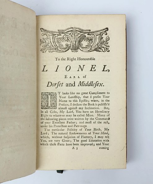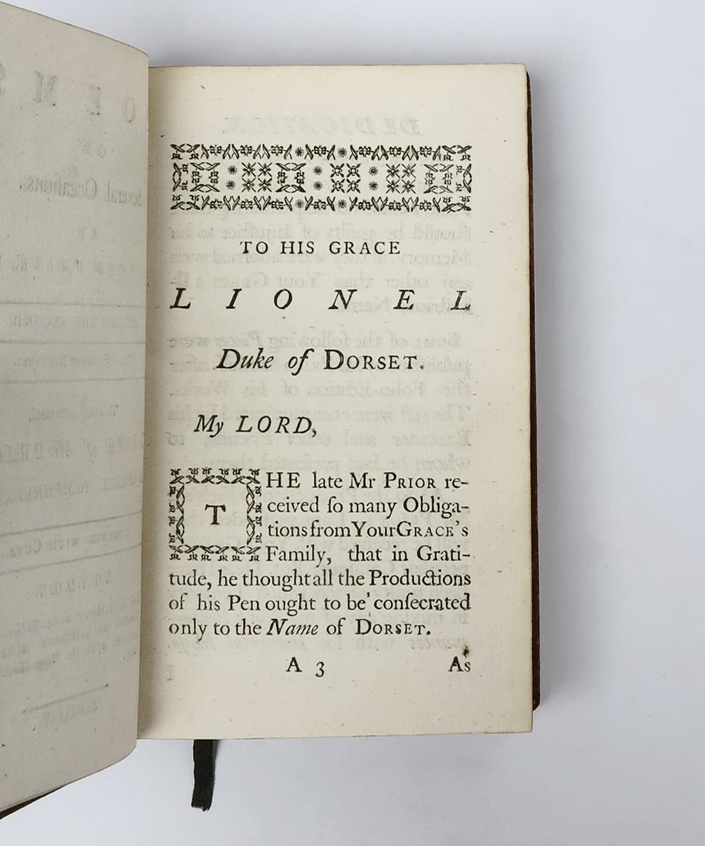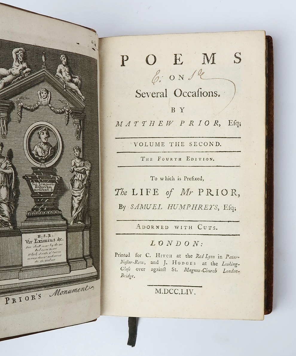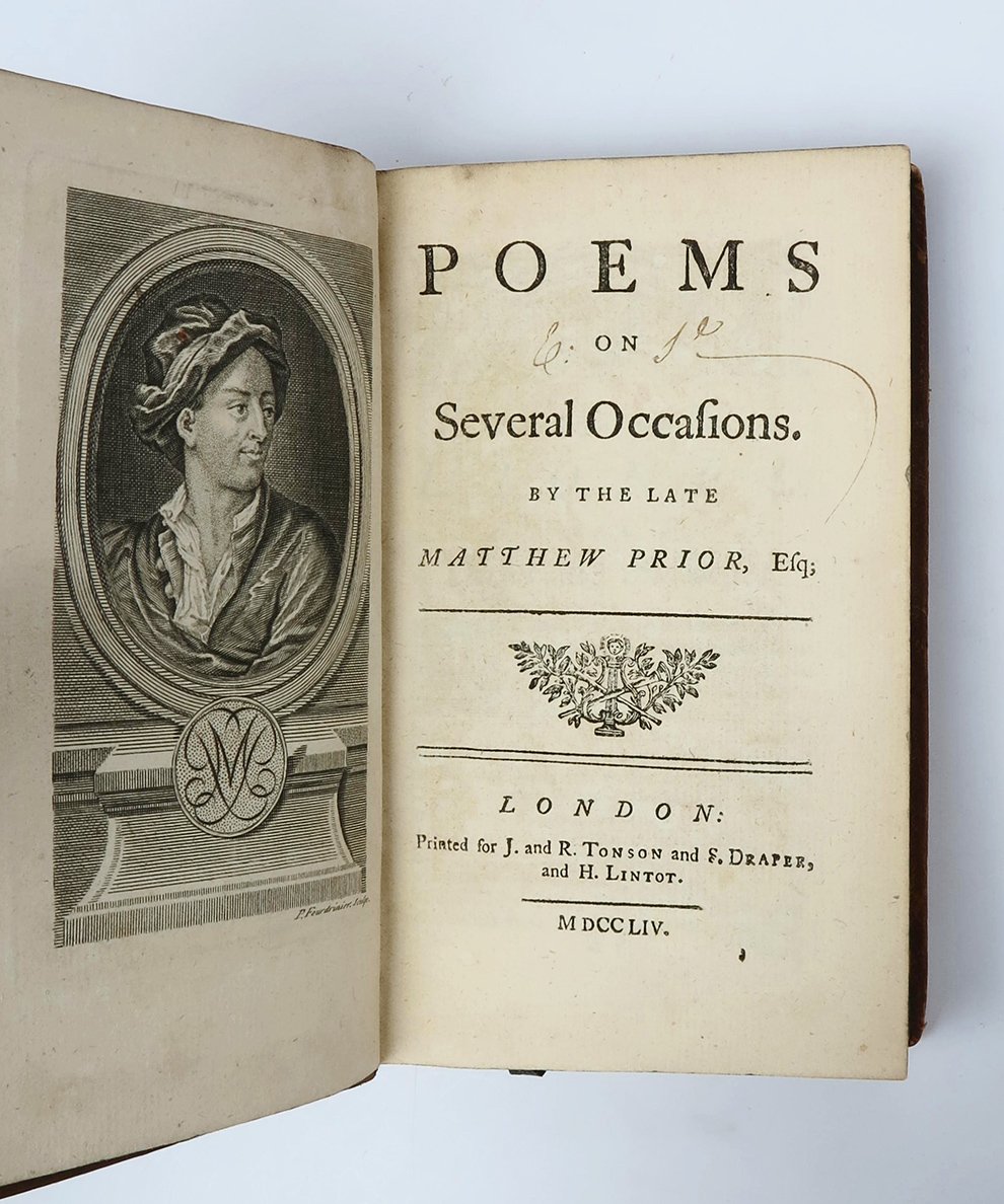 Two imprints in two volumes, comprising a complete set of the fourth edition, which includes works not by Prior, namely Hildebrand Jacob’s notorious erotic poem ‘The Curious Maid’. Duodecimos, pp., [22], 402, [6] index; lxii, 356; sig., A-S12; A12 a-b