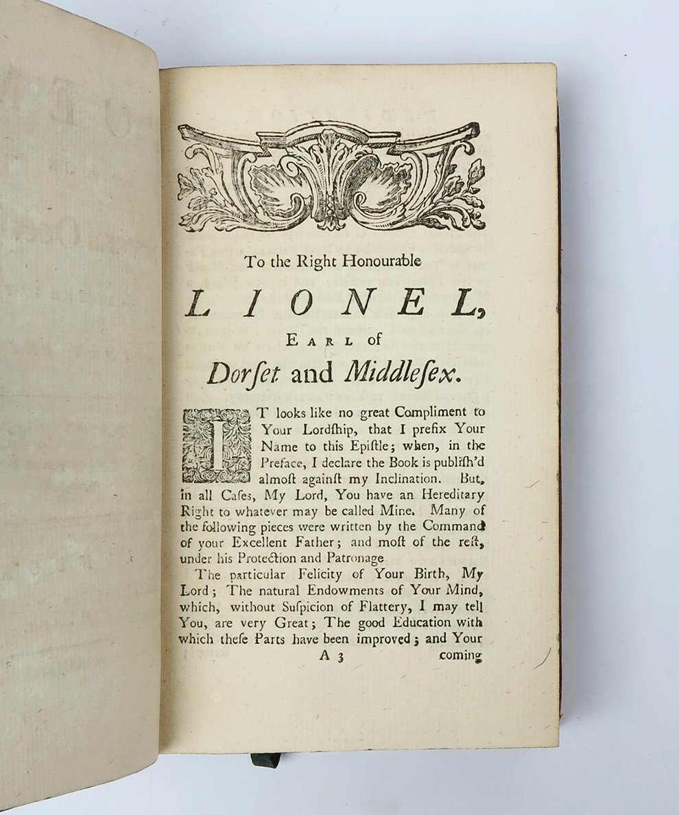 A two-volume set of poetic miscellanies, predominantly of the works of Matthew Prior (1664–1721), but with a curious, amatory section to the end of volume two. Prior was a poet, statesman, and Tory ally to Robert Harley and the Scriblerians. His biographer states that his primary interests were ‘women, collecting, friends, a country estate, and writing.’ He was ‘arguably the most important poet writing in English between the death of Dryden (1700) and the poetic majority of Pope in 1712’ (ODNB). He proved a continually popular entry in miscellanies, a form of publication which gathered together various works, sometimes on a theme. This set is a rather curious miscellany, while dominated by Prior’s works, approximately the final third of volume 2 consists of ‘Original Poems and Translations by Various Hands’ - a deliberately vague title to a truly varied selection of poetry. A reader’s interest may have been piqued by the first poem in the section, Hildebrand Jacob’s amatory verse on female auto-eroticism ‘The Curious Maid’ (often misattributed to Prior), which is accompanied by an engraved plate of a woman using a mirror to peek under her own skirts. What follows are a series of amatory, bawdy, and controversial works, many laden with innuendo (as in ‘The Silent Flute: Or the Members Speech to their Soveraign’ [sic.]), while others use the tried-and-true guise of classical translation to depict scenes of ‘heaving breasts and extended thighs’. Other poems in the collection are on less lurid but still interesting and controversial topics: Bedlam, snuff, marriage, politics, and the manners of the day. The title rather overstates the ‘original’ nature of the works: they mostly appear to be printed from earlier sources, but their gathering together here nonetheless places these poems in new contexts. Miscellanies were an important venue for erotic, amatory, and controversial works (indeed, much of John Wilmot, Earl of Rochester’s poetry was first published in miscellanies by Edmund Curll). This set appears to be scarce with all the plates, and represents an interesting combination of respectable, mainstream, and clandestine verse in two well-preserved volumes.