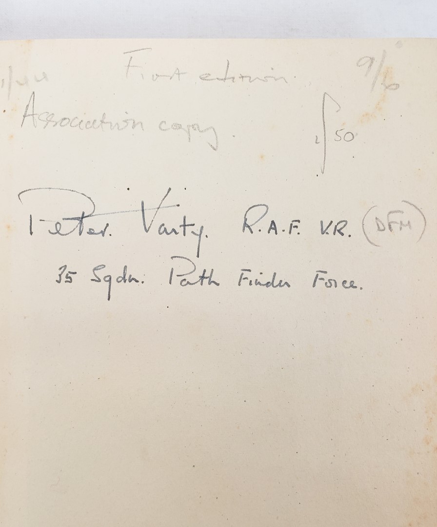 ASSOCIATION COPY. 271 pp. Book Condition: Very Good. Jacket Condition: Good. Beige cloth with red titles in unclipped pictorial dust-jacket. Endpapers and textblock edge foxed. Inscribed to ffep : "Peter Varty. R. A. F. V. R. 35 Sqdn Path Finder Force". Jacket lightly foxed with several creases, splits and tears including 4-inch tear to front cover; rear white panel toned. Peter Varty was awarded the Distinguished Flying Medal, given to non-commissioned personnel for "an act or acts of valour, courage or devotion to duty whilst flying in active operations against the enemy". The novel is the story of a typical Pathfinder crew, their backstories and their mission to raid a target in Germany so would have been of great interest to one who had personally lived through similar experiences.