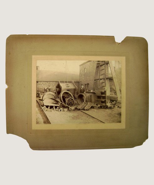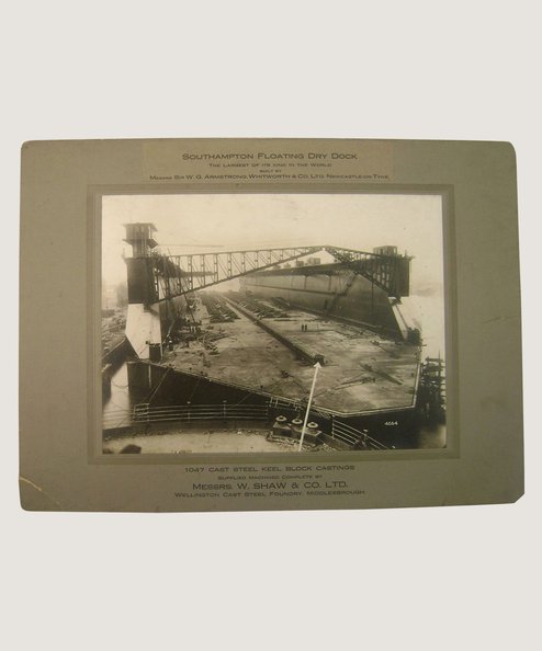 W Shaw & Co Photograph Archive. Collection of fifteen superb mounted and titled early twentieth century silver gelatin prints depicting armament manufacture at the Wellington Cast Steel Foundry in Middlesbrough, owned by William Shaw & Co. The largest five magnum prints are 22 x 28 inches (including mount) and show the manufacture of 'Cast Steel Ariel Bombs for the Great War', four of these images are reproduced as smaller prints of 13 x 17 inches (including mount). Two photographs are approx 21 x 15 1/2 inches and show variously the 'Main Casting of Stern Frame for Admiralty Twin Screw Tank Steamer' and a superb image of 'Southampton Floating Dry Dock, The Largest of its Kind in the World' built by Armstrong Whitworth & Co Ltd, Newcastle Upon Tyne. Another image is 12 x 9 1/2 inches and shows a cast Steel Blast Box for a Bessemer Convertor and one untitled image of the same size of cast machinery in the Shaw yard. A further image (21 x 17 inches) shows a train of '12 Cast Steel Slag Ladles and Carriages' with the W. Shaw Blast Furnace in the background, lastly a smaller image (20 x 10 1/2 inch) of a train of cast steel ships propellers. Minor soiling to mounts with chips and to extremities, professional archival repair to one mount but overall in very good condition.