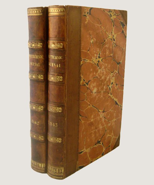 Matching bound volumes of the periodical covering January-June 1842 and January -June 1843 (six issues per volume). Octavo, pp iv, 400, [1] & v, 442. Illustrated including fold out Railway Signals plate to 1842 and double-page plate and fold-out of paving specifications to 1843. Half polished calf with 4 raised bands, gilt titles to spine and gilt decoration to bands; marbled paper-covered boards and all edges marbled. Spines lightly toned; upper joint of 1842 Volume just starting and of 1843 Volume cracked but very firmly holding. Boards lightly surface scuffed with small chip to paper lower board 1842; minor wear to corners. Foxing to early and late leaves of both volumes; ownership inscription to 1842 in ink and pencil notes at head of 1842 p1 and 1843 Index. Good condition.