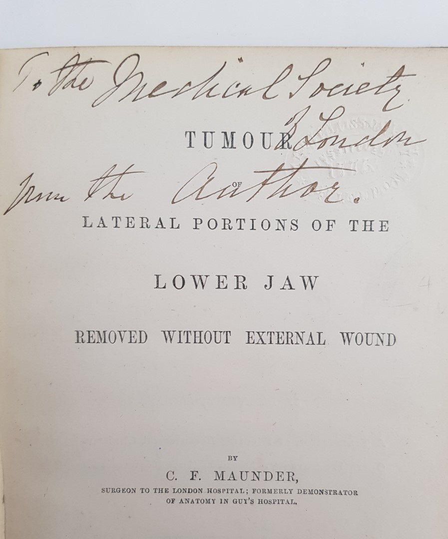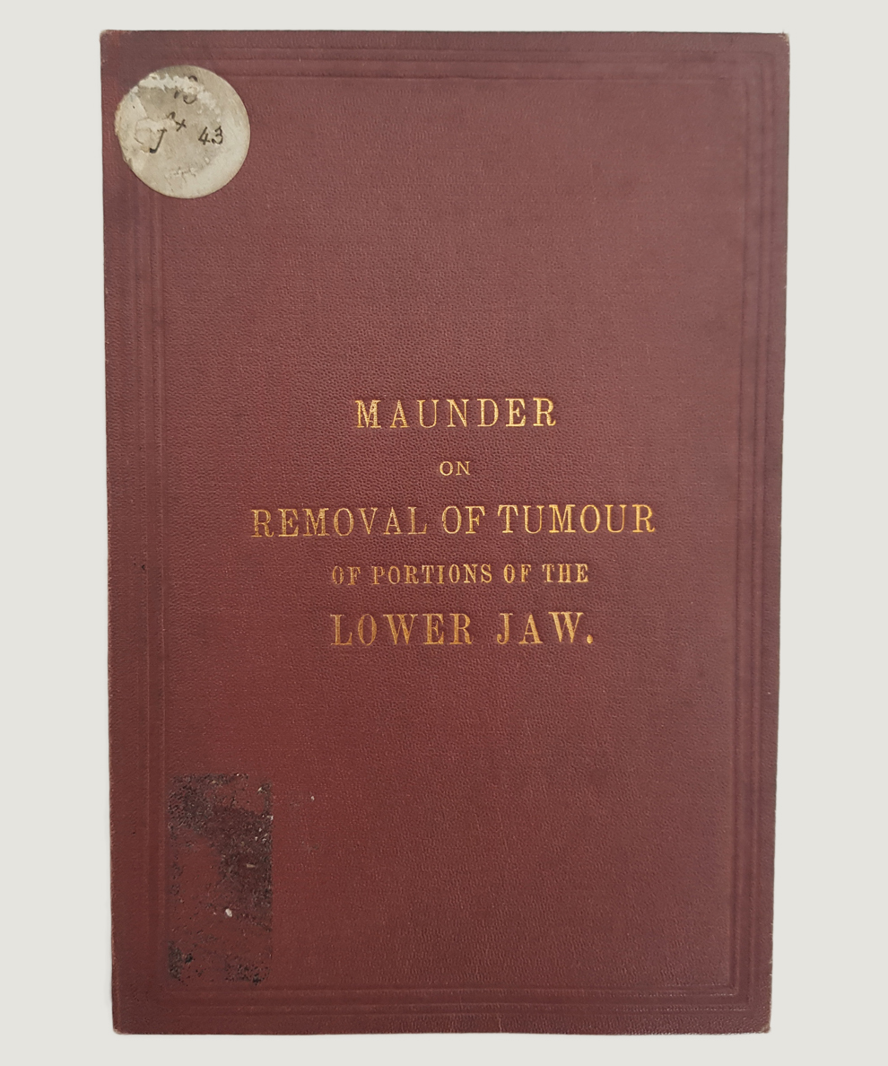 27 pp. 5 figures in text. Original cloth gilt with blindstamped decoration to boards. Ex-library copy with paper label to upper board, the usual stamps etc and portion of ffep absent. Ffep split at joint for lower four inches; overall in near very good condition. PRESENTATION COPY, inscribed by the Author “To the Medical Society of London”. Scarce surgical title.