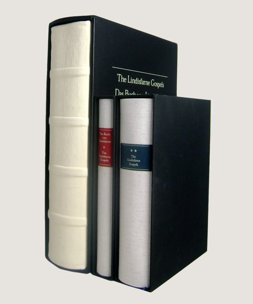 Das Buch von Lindisfarne octavo, pp 333, [1]. Commentary volumes bound in uniform oatmeal cloth with respectively blue and red printed title panels to spine and silk placemarkers, each housed in a plain black cloth-covered slipcase. All volumes Fine. Very minor scuffing to slipcases, which are Near Fine. Limitation leaf of Gospels, and title page of each commentary with discreet stamp: