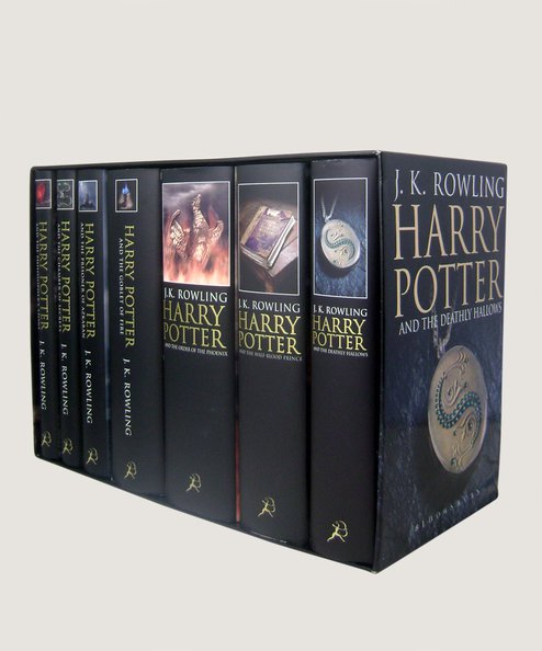 Adult edition seven volume boxed set. Octavo, pp. 223, 251, 317, 636, 766, 607, 607. Black cloth with gilt titles to spine in matching pictorial dust-jackets. Housed in single printed card slipcase with silk ribbon opener. All SIGNED uniformly by the Author to title page in black ink with a BLOOMSBURY SIGNATURE AUTHENTICATION HOLOGRAPHIC STICKER to verso of each half-title. All volumes and jackets in fine condition and appear unread. Slipcase scuffed to edge with minor split to paper at lower edge and bruised lower corner.