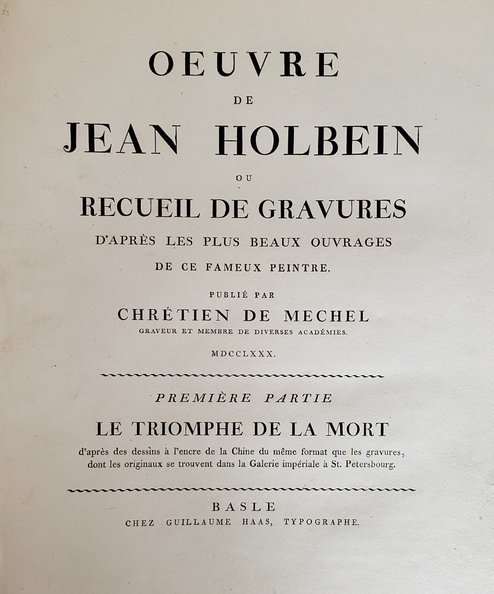 Mechel’s edition of Hans Holbein’s work, from originals in the Imperial Gallery of St Petersburg and the Bibliotheque Publique a Basle. This copy does not include the 2 plates at the end of Part IV of the family of Thomas More which are are usually absent.