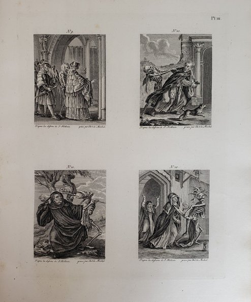 FIRST EDITION. Folio, 4 parts in one volume; 2 engraved title leaves, 1 aquatint title and 51 plates as called for. Part I: title leaf, pp., [3]-12, [2], 12 plates with 47 numbered subjects (Holbein’s Dance of Death) & 2 plates, of Le Triomphe de la Richesse and Le Triomphe de Pauvrete; Part II: engraved title leaf and 12 plates; Part III: Aquatint title leaf and 12 aquatint plates numbered in 2 sets of 6, with 3 additional un-numbered aquatint plates, of which 2 double-page; Part IV: decorative title page with blue panel & 10 portrait plates. Later black quarter morocco with gilt titles and blind ruling to spine over navy blue pebbled cloth; marbled endpapers. Spine scuffed with minor wear at tips; wear to board edges. Two different pictorial bookplates to front paste-down. Text leaves lightly toned; a little offsetting otherwise contents clean. A Very Good copy.