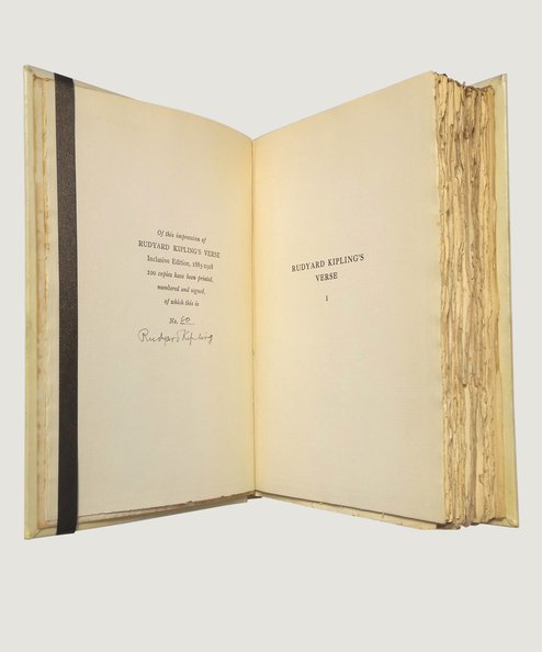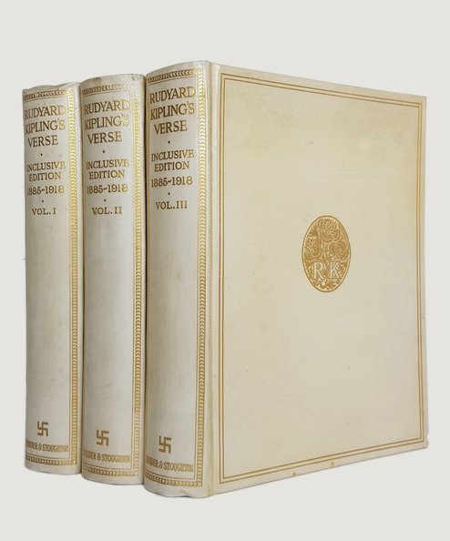 DELUXE SIGNED LIMITED EDITION: Number 80 of only 100 signed and numbered copies. Octavo, pp., [6], v-x, 317, [1]; [6], v-ix, [1], [1], 323, [6], v-x, 291, [1]. Full vellum with gilt titles and decoration to spine and gilt oval vignette to upper board incorporating Kipling’s initials with floral design. Top edge gilt, others uncut. Very minor bruising to corners & spine tips; vellum unusually clean and bright. Minor toning to endpapers. All three volumes SIGNED and numbered by Kipling to the limitation leaf. A FINE set.