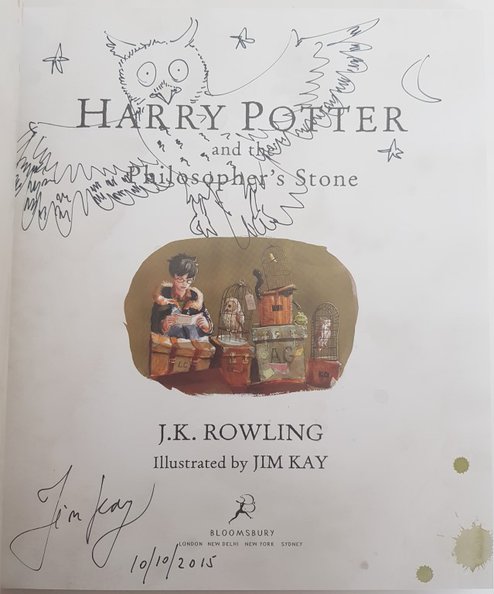 FIRST ILLUSTRATED EDITION first printing, with complete number line, SIGNED BY ARTIST WITH ORIGINAL ARTWORK. Square quarto, pp. [8], 245, [3]. Colour illustrations by Jim Kay throughout, many full-page. Publishers’ scarlet cloth with metallic blue titles to spine, silk place-marker and pictorial endpapers, in unclipped pictorial dust-jacket. Very slight bruising to lower corner tips otherwise a Fine copy in like jacket, with bold signature of Jim Kay at the foot of title page dated 10/10/2015 and large original sketch of Hedwig in a starry sky over titles above.