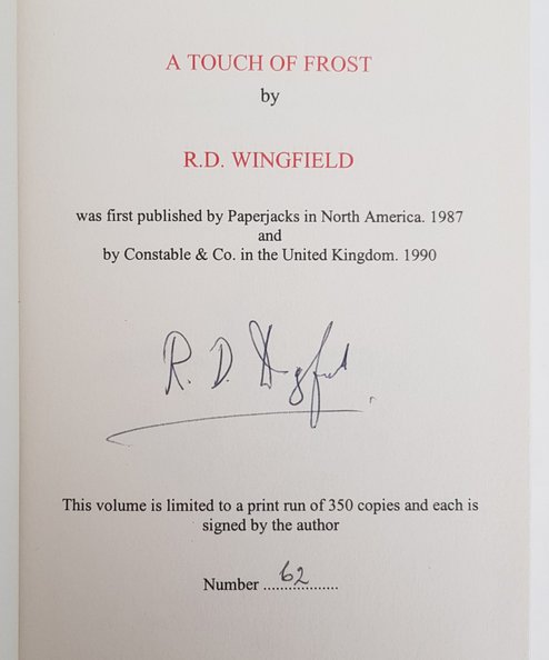 The second Wingfield novel to feature Inspector Jack Frost which inspired the popular television series of the same name. Limited to only 350 copies and signed boldly to the author to the edition leaf.