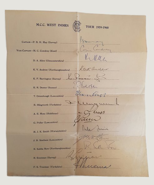 Single sheet with printed heading & crest and list of entire team and their counties from Captain P. B. H. May to F. S. Trueman, with each of their signatures adjacent, comprising 15 signatures (complete). Single vertical and 3 horizontal creases from folding, and tiny pin-hole at head above crest, otherwise crisp. Signatures of every player, in various inks. A Very Good copy.
