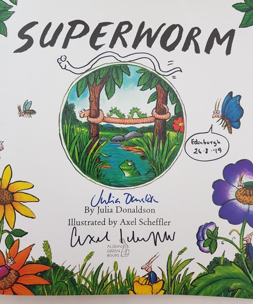 Boldly signed to the title-page by the former UK Children’s Laureate and internationally acclaimed author, Julia Donaldson, and the world renowned children’s illustrator Axel Scheffler. With an charming original sketch of Superworm by Scheffler with “Edinburgh 26.8.2019” in speech bubble. Superbly original superhero adventure by the creators of The Gruffalo. This long-running collaborative partnership has produced many modern classics loved by adults and children alike.