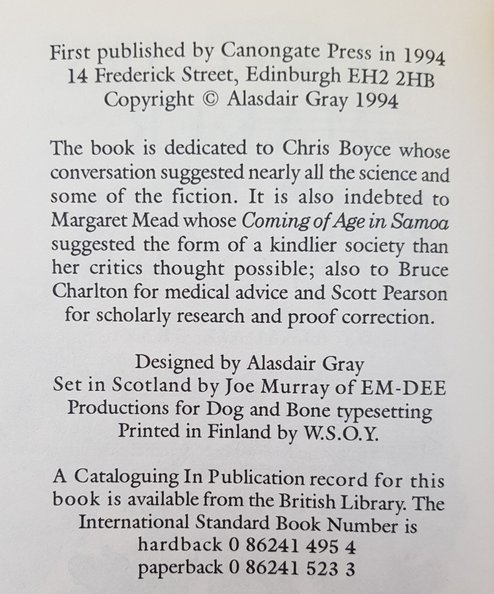 Small octavo, pp. xv, [1], 222, [2]. With illustrations by Gray. Bound in blue cloth blocked in silver, with silver titles to spine, and orange endpapers. In the unclipped publishers pictorial dust-jacket. Promotional bookshop slip, designed and signed by Alasdair Gray loosely inserted.